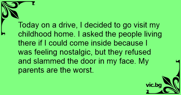Today on a drive, I decided to go visit my childhood home. I asked the people living there if I could come inside because I was feeling nostalgic, but they refused and slammed the door in my face. My parents are the worst.