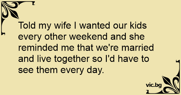 Told my wife I wanted our kids every other weekend and she reminded me that we're married and live together so I'd have to see them every day.