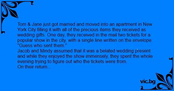 Tom & Jane just got married and moved into an apartment in New York City filling it with all of the precious items they received as wedding gifts. One day, they received in the mail two tickets for a popular show in the city, with a single line written on the envelope: