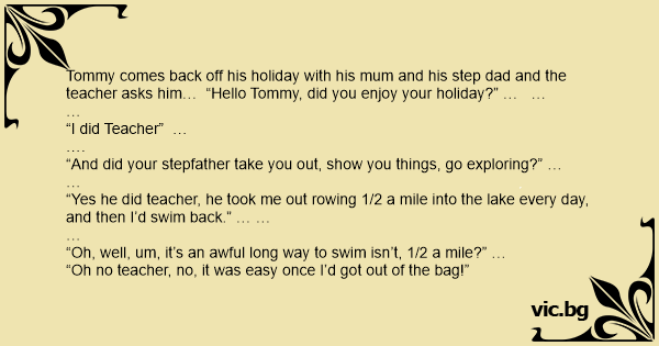 Tommy comes back off his holiday with his mum and his step dad and the teacher asks him… “Hello Tommy, did you enjoy your holiday?” … …