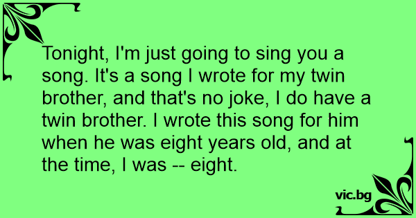 Tonight, I'm just going to sing you a song. It's a song I wrote for my twin brother, and that's no joke, I do have a twin brother. I wrote this song for him when he was eight years old, and at the time, I was -- eight.