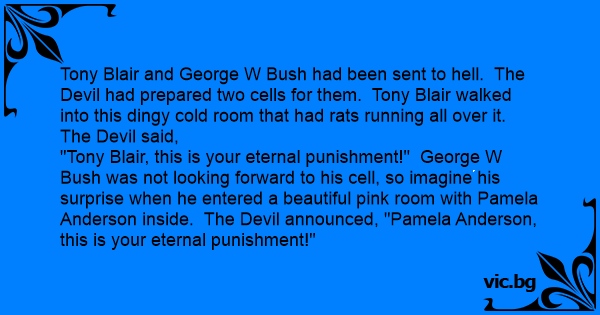 "Tony Blair, this is your eternal punishment!" George W Bush was not looking forward to his cell, so imagine his surprise when he entered a beautiful pink room with Pamela Anderson inside. The Devil announced, "Pamela Anderson, this is your eternal punishment!"
