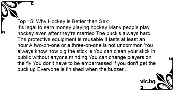 Top 15: Why Hockey is Better than Sеx: It's legal to earn money playing hockey Many people play hockey even after they're married The puck's always hard The protective equipment is reusable It lasts at least an hour A two-on-one or a three-on-one is not uncommon You always know how big the stick is You can clean your stick in public without anyone minding You can change players on the fly You don't have to be embarrassed if you don't get the puck up Everyone is finished when the buzzer sounds Your parents cheer when you score Periods last only 20 minutes You're sure to get it at least twice a week You can tell your friends about it afterwards