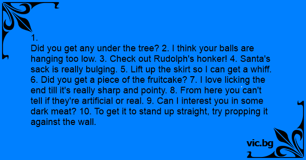 Did you get any under the tree? 2. I think your ваlls are hanging too low. 3. Check out Rudolph's honker! 4. Santa's sack is really bulging. 5. Lift up the skirt so I can get a whiff. 6. Did you get a piece of the fruitcake? 7. I love licking the end till it's really sharp and pointy. 8. From here you can't tell if they're artificial or real. 9. Can I interest you in some dark meat? 10. To get it to stand up straight, try propping it against the wall.