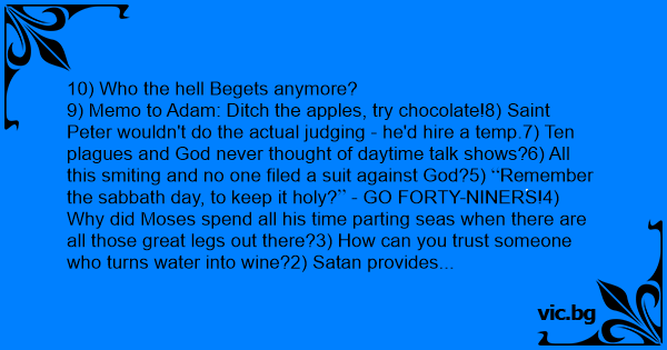 9) Memo to Adam: Ditch the apples, try chocolate!8) Sаinт Peter wouldn't do the actual judging - he'd hire a temp.7) Ten plagues and God never thought of daytime talk shows?6) All this smiting and no one filed a suit against God?5) Remember the sabbath day, to keep it holy? - GO FORTY-NINERS!4) Why did Моsеs spend all his time parting seas when there are all those great legs out there?3) How can you trust someone who turns water into wine?2) Sатаn provides free heating, work for everyone, never evicts you and doesn't give a dамn about your credit rating. This is bad HOW?1.) Out with Into the ark, two by two, in with Jerry Springer love triangles!