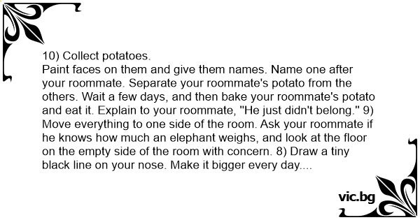 Paint faces on them and give them names. Name one after your roommate. Separate your roommate's potato from the others. Wait a few days, and then bake your roommate's potato and eat it. Explain to your roommate, ''He just didn't belong.'' 9) Move everything to one side of the room. Ask your roommate if he knows how much an elephant weighs, and look at the floor on the empty side of the room with concern. 8) Draw a tiny black line on your nose. Make it вiggеr every day. Look at it and say, ''The hair, it's growing. Growing!'' 7) Buy some knives. Sharpen them every night. While you're doing so, look at your roommate and mutter, ''Soon, soon....'' 6) Collect hundreds of pens and pile them on one side of the room. Keep one pencil on the other side of the room. Laugh at the pencil. 5) Tell your roommate, ''I've got an important message for you.'' Then pretend to faint. When you recover, say you can't remember what the message was. Later on, say, ''Oh, yeah, I remember!'' Pretend to faint again. Keep this up for several weeks. 4) While your roommate is out, glue your shoes to the ceiling. When your roommate walks in, sit on the floor, hold your head, and moan. 3) Make a sandwich. Don't eat it, leave it on the floor. Ignore the sandwich. Wait until your roommate gets rid of it, and then say, ''Hey, where the heck is my sandwich!?'' Complain loudly that you are hungry. 2) Every time your roommate walks in yell, ''Hooray! You're back!'' as loud as you can and dance around the room for five minutes. Afterwards, keep looking at your watch and saying, ''Shouldn't you be going somewhere?'' 1) Talk back to your Rice Krispies. All of a sudden, act offended, throw the bowl on the floor and kick it. Refuse to clean it up, explaining, ''No, I want to watch them suffer.'''