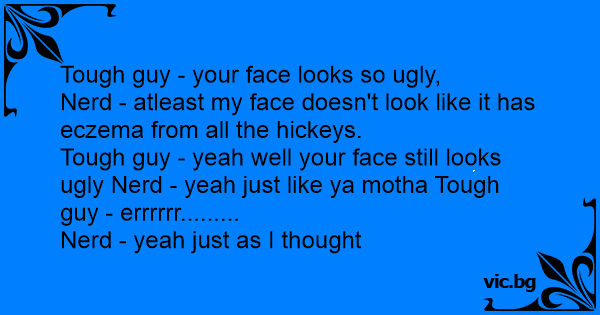 Tough guy - yeah well your face still looks ugly Nerd - yeah just like ya motha Tough guy - errrrrr.........