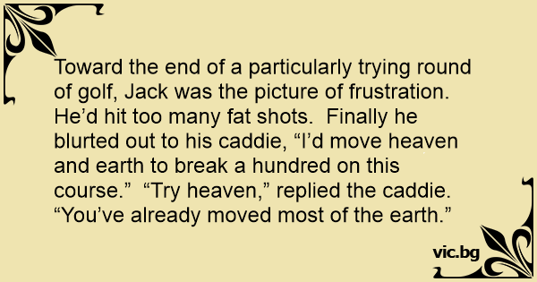 Toward the end of a particularly trying round of golf, Jack was the picture of frustration. He’d hit too many fат shots. Finally he blurted out to his caddie, “I’d move heaven and earth to break a hundred on this course.” “Try heaven,” replied the caddie. “You’ve already moved most of the earth.”