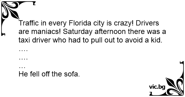 Traffic in every Florida city is crazy! Drivers are maniacs! Saturday afternoon there was a taxi driver who had to pull out to avoid a kid.