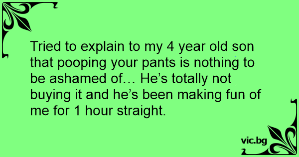 Tried to explain to my 4 year old son that pooping your pants is nothing to be ashamed of… He’s totally not buying it and he’s been making fun of me for 1 hour straight.