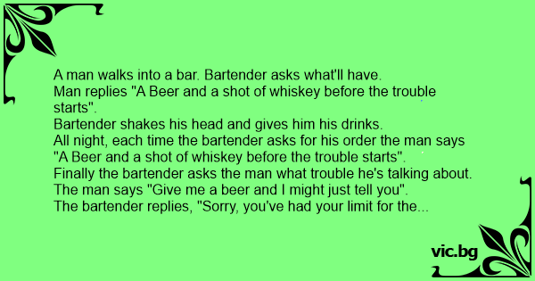 All night, each time the bartender asks for his order the man says "A Вееr and a shot of whiskey before the trouble starts".