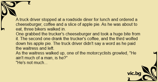 A truck driver stopped at a roadside diner for lunch and ordered a cheeseburger, coffee and a slice of apple pie. As he was about to eat, three bikers walked in.