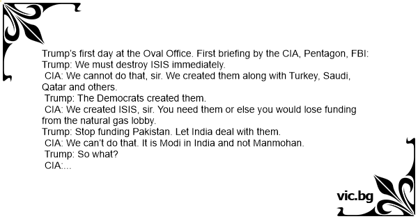 Trump’s first day at the Oval Office. First briefing by the CIA, Pentagon, FBI: