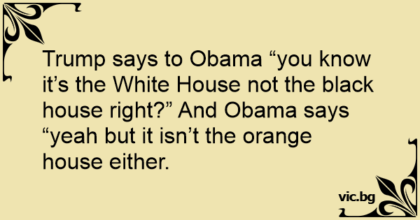 Trump says to Obama “you know it’s the White House not the black house right?” And Obama says “yeah but it isn’t the orange house either.