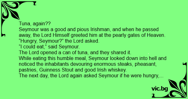 Meekly, Seymour said, “Lord, I am very happy to be be in Heaven as a reward for the good life I lived. But, this is Heaven, and all I get to eat is tuna. In the other place, they eat like Kings. I just don’t understand.”