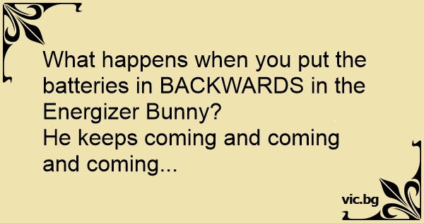 What happens when you put the batteries in BACKWARDS in the Energizer Bunny?<br />He keeps coming and coming and coming...