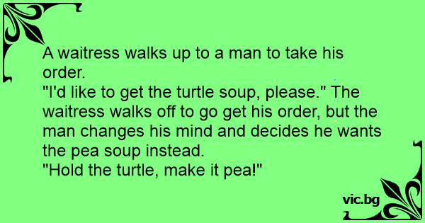 "I'd like to get the turtle soup, please." The waitress walks off to go get his order, but the man changes his mind and decides he wants the pea soup instead.