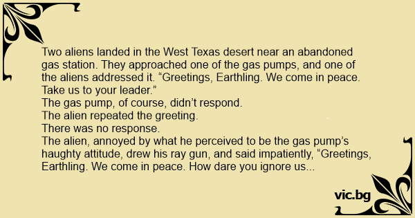 Two aliens landed in the West Texas desert near an abandoned gas station. They approached one of the gas pumps, and one of the aliens addressed it. “Greetings, Earthling. We come in peace. Take us to your leader.”