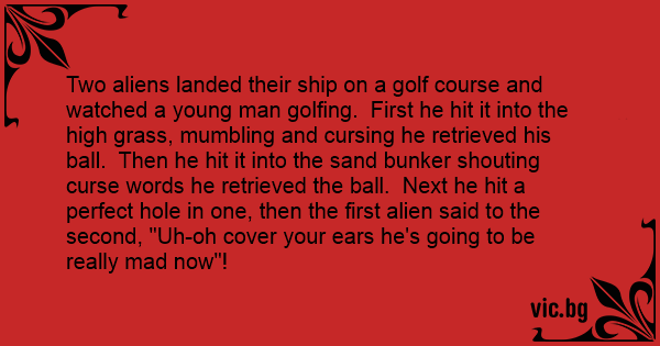 Two aliens landed their ship on a golf course and watched a young man golfing. First he hit it into the high grass, mumbling and cursing he retrieved his ball. Then he hit it into the sand bunker shouting curse words he retrieved the ball. Next he hit a perfect hole in one, then the first alien said to the second, "Uh-oh cover your ears he's going to be really mad now"!