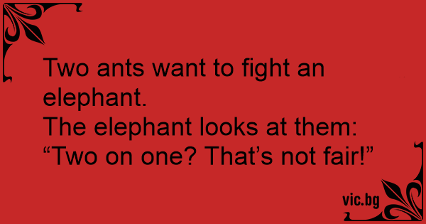 Two ants want to fight an elephant.<br />The elephant looks at them: “Two on one? That’s not fair!”