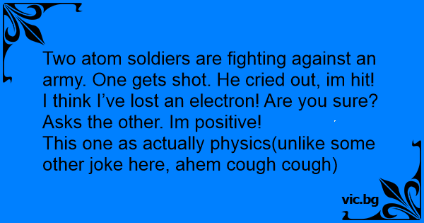 Two atom soldiers are fighting against an army. One gets shot. He cried out, im hit! I think I’ve lost an electron! Are you sure? Asks the other. Im positive!