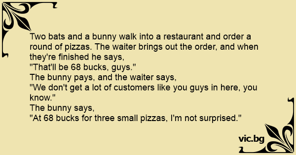 Two bats and a bunny walk into a restaurant and order a round of pizzas. The waiter brings out the order, and when they're finished he says,