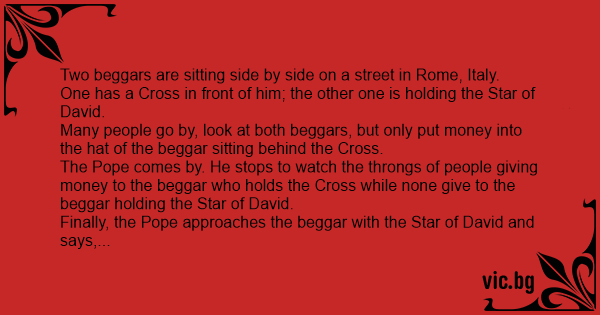 Finally, the Pope approaches the beggar with the Star of David and says, “My poor fellow, don’t you understand? This is a Catholic country; this city is the seat of Catholicism. People aren’t going to give you money if you sit there with a Star of David in front of you, especially when you’re sitting beside a beggar who is holding a Cross. In fact, they would probably give more money to him just out of spite.”