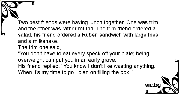Two best friends were having lunch together. One was trim and the other was rather rotund. The trim friend ordered a salad, his friend ordered a Ruben sandwich with large fries and a milkshake.