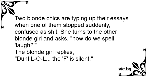 Two blonde chics are typing up their essays when one of them stopped suddenly, confused as shiт. She turns to the other blonde girl and asks, "how do we spell 'laugh?'"