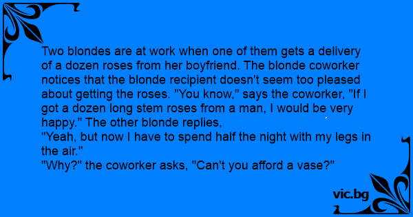 Two blondes are at work when one of them gets a delivery of a dozen roses from her boyfriend. The blonde coworker notices that the blonde recipient doesn't seem too pleased about getting the roses. "You know," says the coworker, "If I got a dozen long stem roses from a man, I would be very happy." The other blonde replies,