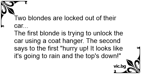 The first blonde is trying to unlock the car using a coat hanger. The second says to the first "hurry up! It looks like it's going to rain and the top's down!"
