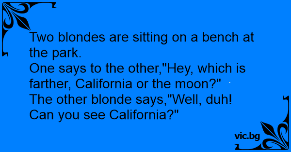 Den ene blondine spørg den anden, blondine om hvad der ligger længst væk, London eller månen. Den anden blondine svarer, er du dum eller hvad, kan du måske se London her fra?