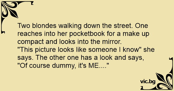 Two blondes walking down the street. One reaches into her pocketbook for a make up compact and looks into the mirror.