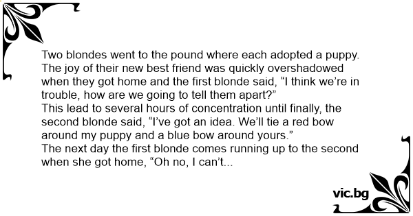 The next day the first blonde comes running up to the second when she got home, “Oh no, I can’t tell whose puppy is whose. They’ve pulled the ribbons off while they were playing.”