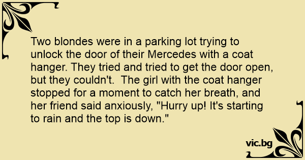 Two blondes were in a parking lot trying to unlock the door of their Mercedes with a coat hanger. They tried and tried to get the door open, but they couldn't. The girl with the coat hanger stopped for a moment to catch her breath, and her friend said anxiously, "Hurry up! It's starting to rain and the top is down."