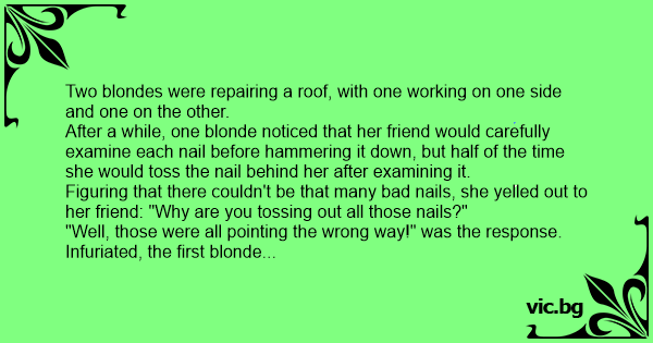 After a while, one blonde noticed that her friend would carefully examine each nail before hammering it down, but half of the time she would toss the nail behind her after examining it.