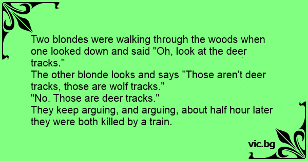 The other blonde looks and says "Those aren't deer tracks, those are wolf tracks."
