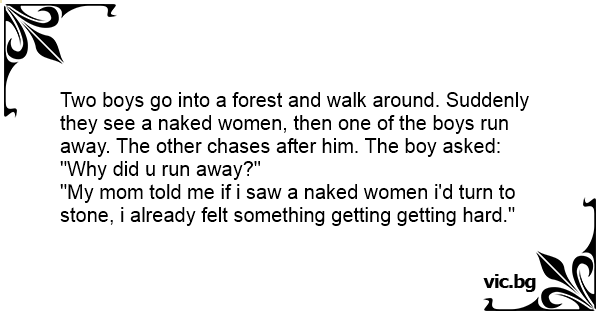 Two boys go into a forest and walk around. Suddenly they see a nакеd women, then one of the boys run away. The other chases after him. The boy asked: