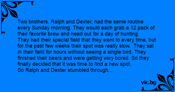 Two brothers, Ralph and Dexter, had the same routine every Sunday morning. They would each grab a 12 pack of their favorite brew and head out for a day of hunting.