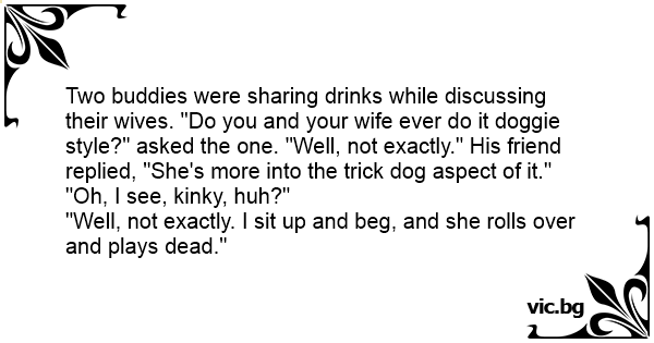Two buddies were sharing drinks while discussing their wives. "Do you and your wife ever do it doggie style?" asked the one. "Well, not exactly." His friend replied, "She's more into the trick dog aspect of it."