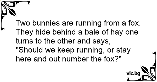 Two bunnies are running from a fox. They hide behind a bale of hay one turns to the other and says,