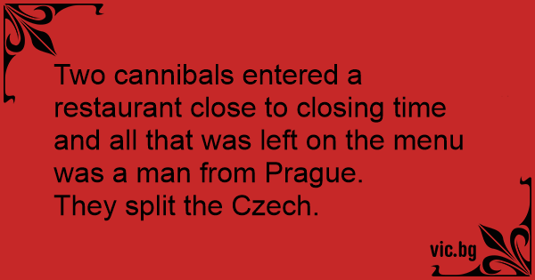 Two cannibals entered a restaurant close to closing time and all that was left on the menu was a man from Prague.