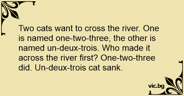 Two cats want to cross the river. One is named one-two-three, the other is named un-deux-trois. Who made it across the river first? One-two-three did. Un-deux-trois cat sank.