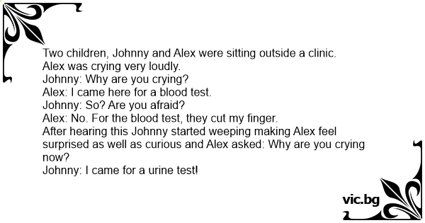 Сидить маленька дівчинка в лікарні й плаче. Підходить до неї хлопчик: — Чому ти плачеш? — Я прийшла робити аналіз крові й мені палець відріжуть. Хлопчик заплакав ще сильніше за дівчинку. — А ти чому плачеш? — запитала дівчинка. — А я прийшов аналіз сечі здавати…