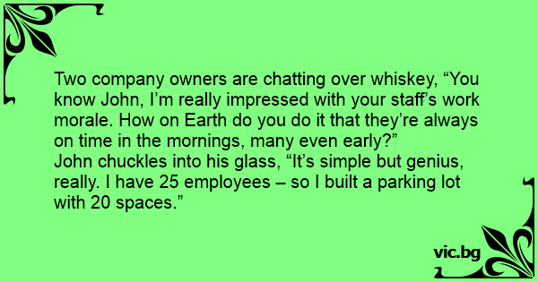 Two company owners are chatting over whiskey, “You know John, I’m really impressed with your staff’s work morale. How on Earth do you do it that they’re always on time in the mornings, many even early?”
