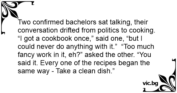 Two confirmed bachelors sat talking, their conversation drifted from politics to cooking. “I got a cookbook once,” said one, “but I could never do anything with it.” “Too much fancy work in it, eh?” asked the other. “You said it. Every one of the recipes began the same way - Take a clean dish.”