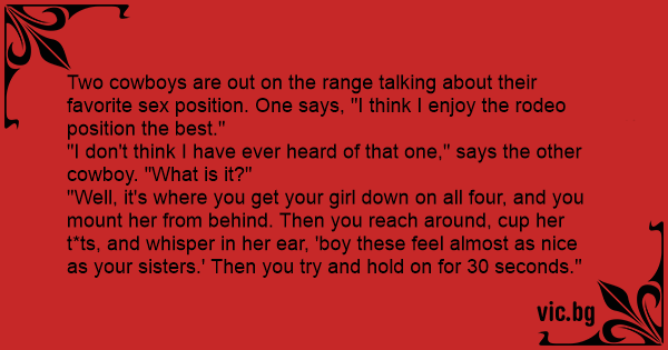 2 cowboys praten over hun favoriete seksstandje "Ik doe 't liefst de rodeo positie," zegt de eerste. "Daar heb ik nog nooit van gehoord," zegt de andere. "Ahwel ,"zegt de eerste: " dat is op zijn...