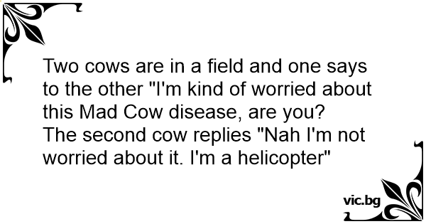 Two cows are in a field and one says to the other "I'm kind of worried about this Mad Соw disease, are you?
