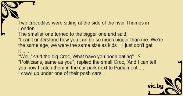 "Politicians, same as you", replied the small Croc, 'And I can tell you how I catch them in the car park next to Parliament.....