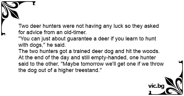 At the end of the day and still empty-handed, one hunter said to the other, "Maybe tomorrow we'll get one if we throw the dog out of a higher treestand."